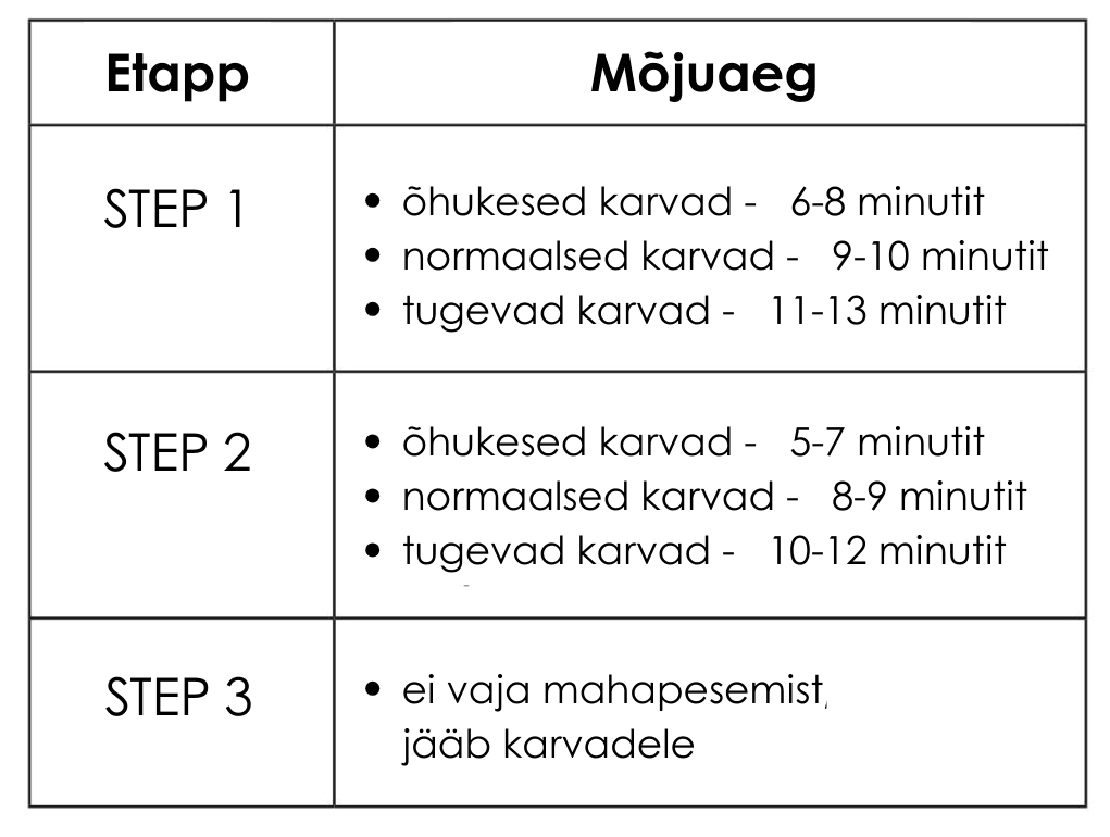 - Kandke tooteaplikaatorit kasutades kulmukarvadele Step 1 emulsioon. Mõjuaeg 3-13 minutit olenevalt karvade tüübist ja seisukorrast. Kontrollige emulsiooni mõju iga minuti tagant võttes pintsettidega üksikust karvast kinni ja painutage seda keskkohast, kui karv paindub terava nurga all, tuleb emulsioon eemaldada! Kui karv paindub raskelt, siis laske emulsioonidel veel veidike mõjuda, kuniks karv paindub terava nurga all. Maksimaalne mõjuaeg ei tohiks ületada valitud karvatüübi jaoks määratud aega!
